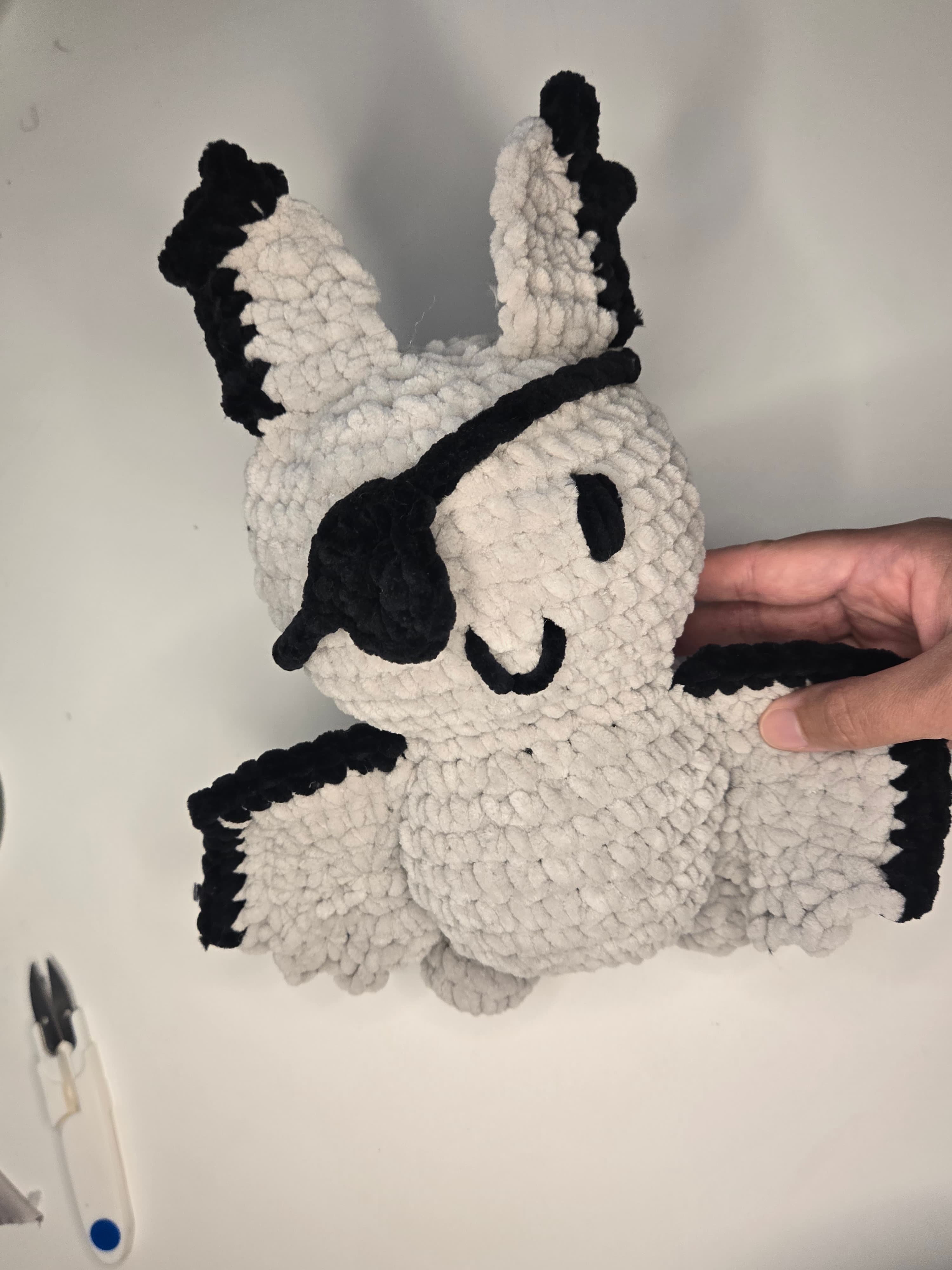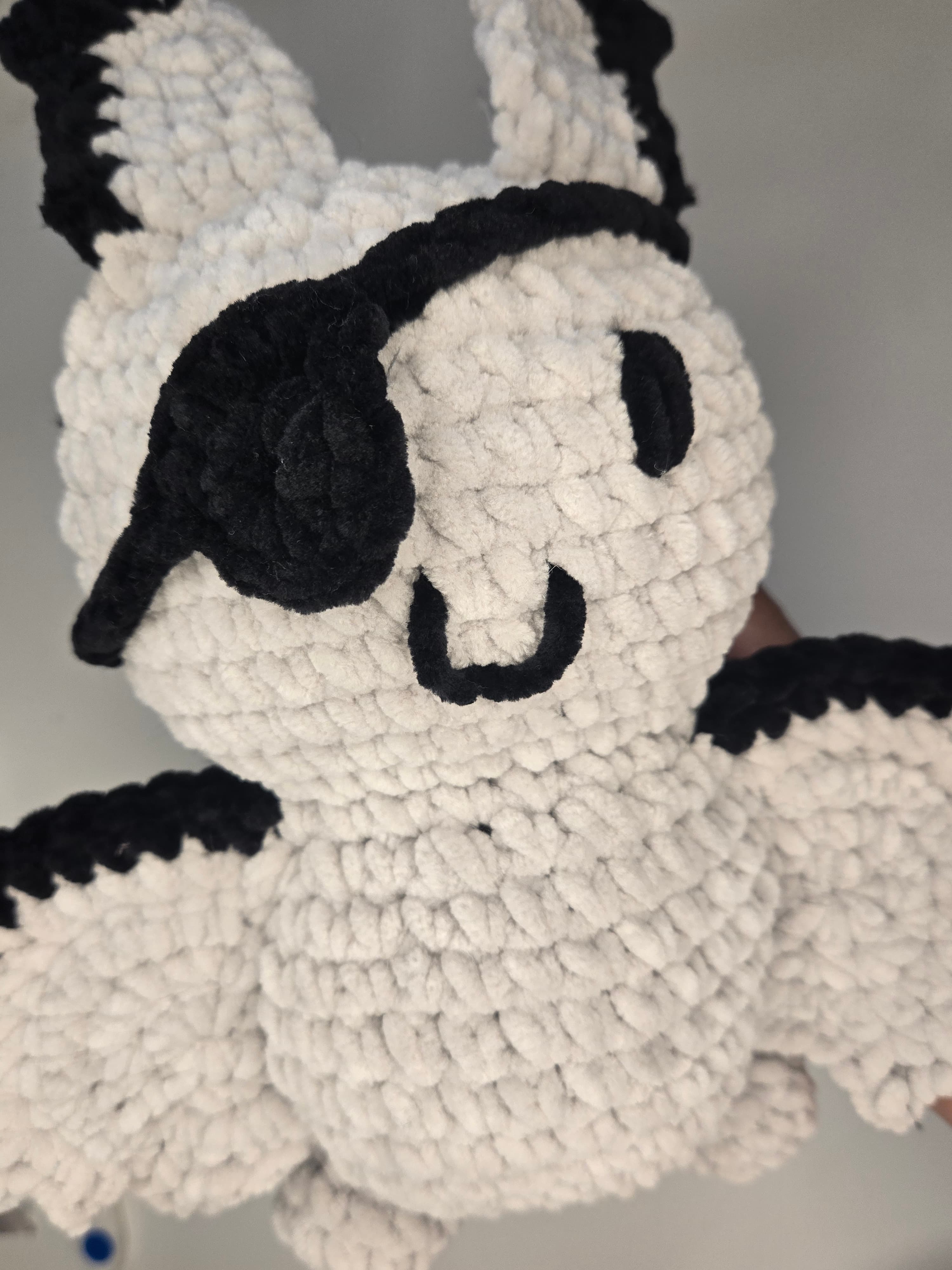 This is the last step for the bat. You can choose to not add the black accents or add them in gray. The face can be made with safety eyes but scrap black yarn works as well.